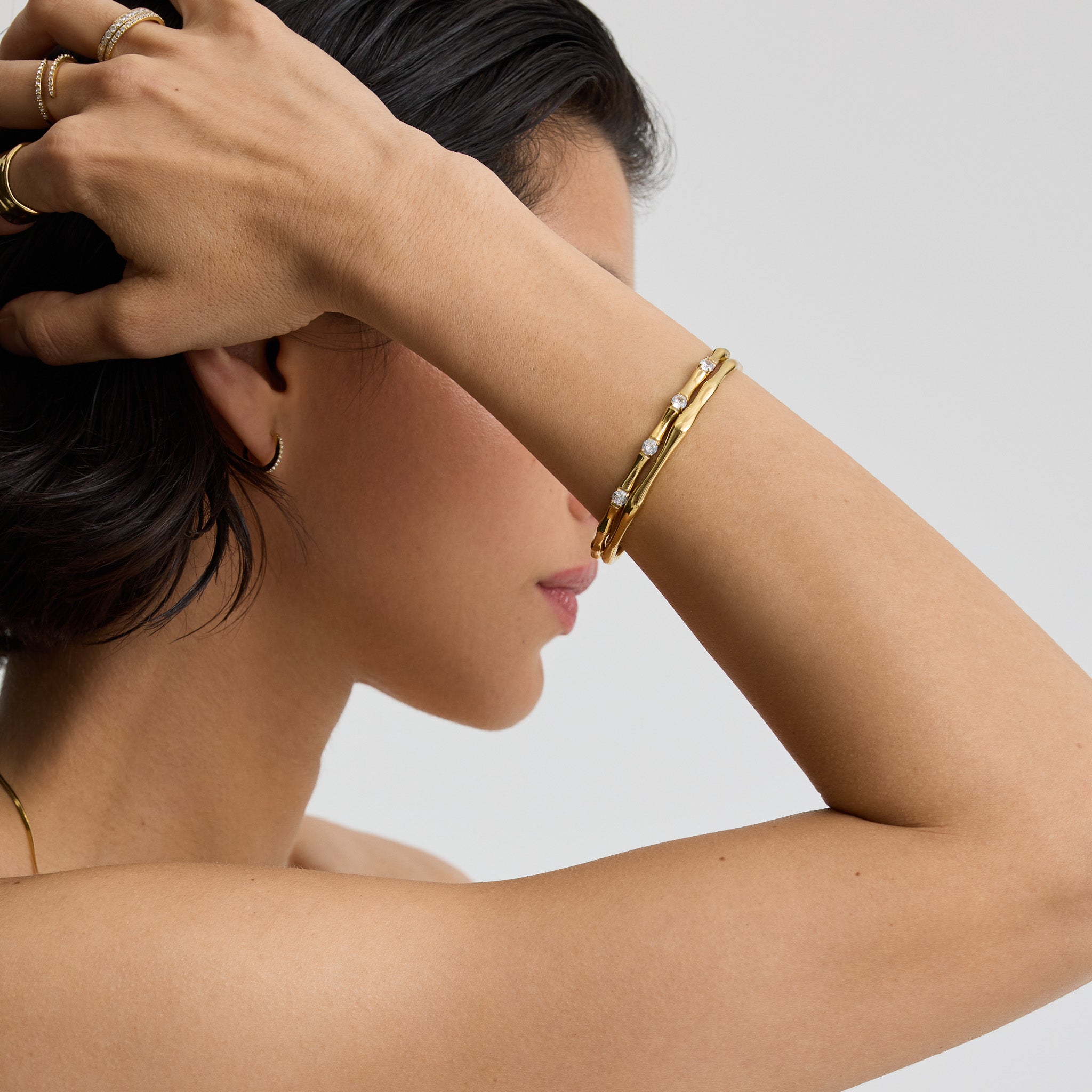 Elevate your bracelet stacks with our Bamboo Bangle duo. This stunning cubic zirconia twist adds a touch of sparkle perfectly paired with our classic bamboo bangle.