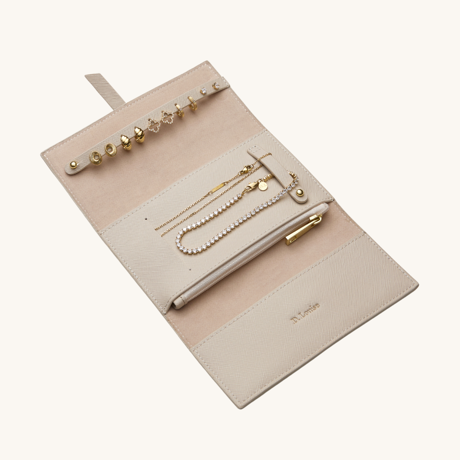 Introducing our exclusive Travel Pouch. The Luxury Jewellery Travel Pouch is the ultimate accessory for keeping your D. Louise pieces safe and tangle-free on the go.